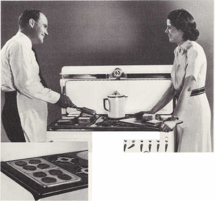 , Husband's delight Chambers offers "a man's stove" where he can produce minute steaks, toasted sandwiches, hamburgers or griddle cakes at a moment's notice. This In-A-T op griddle is a natural for keeping teen age children at home, too. They dote on "kitchen parties". COOKS WITH THE GAS TURNED off |